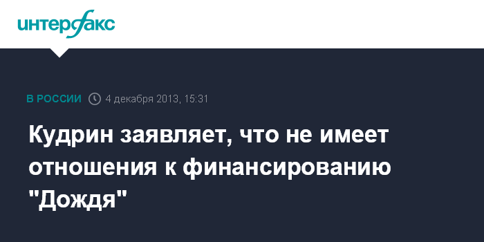 Москва. 4 декабря. INTERFAX.RU - Экс-министр финансов РФ Алексей Кудрин отрицает причастность к организации выделения средств телеканалу "Дождь" и заявляет, что не причастен к инициированию расследования, связанного с декларациями о доходах ряда единороссов.