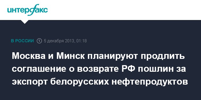 Москва. 5 декабря. ИНТЕРФАКС-АНИ - Россия и Белоруссия планируют продлить на 2014 год срок действия межправсоглашения о порядке уплаты и зачисления вывозных таможенных пошлин при вывозе с территории Белоруссии за пределы таможенной территории Таможенного союза нефти и отдельных категорий нефтепродуктов.