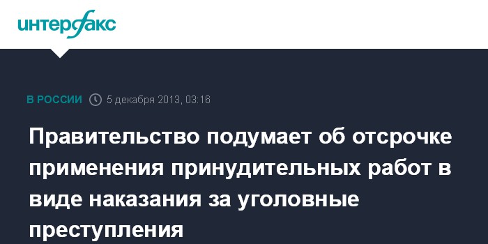 Москва. 5 декабря. INTERFAX.RU - Правительство РФ на заседании в четверг обсудит вопрос об отсрочке до начала 2017 года применения принудительных работ в качестве уголовного наказания.