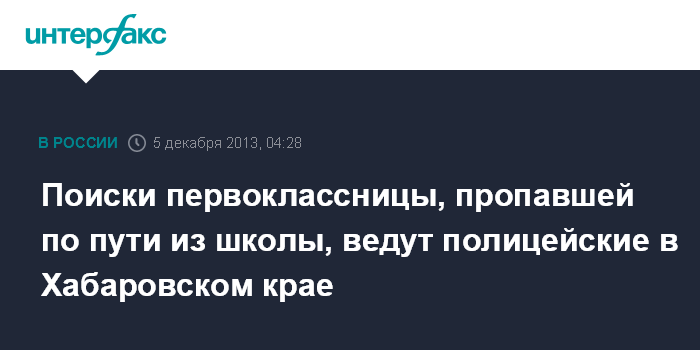 Хабаровск. 5 декабря. ИНТЕРФАКС - ДАЛЬНИЙ ВОСТОК - В Хабаровске организованы поиски семилетней девочки, которая не вернулась из школы, сообщает пресс-служба УМВД по Хабаровскому краю в четверг.