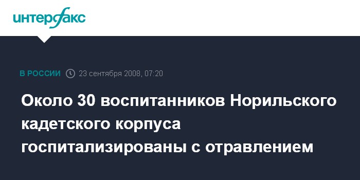 Красноярск. 23 сентября. ИНТЕРФАКС-СИБИРЬ - Воспитанники школы-интерната "Норильский кадетский корпус", расположенной в городе Минусинск Красноярского края, госпитализированы.