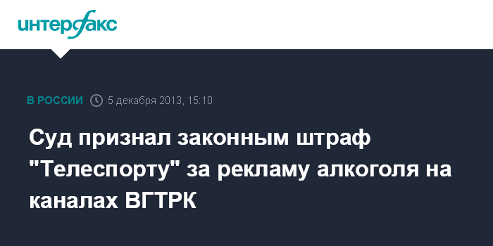 Москва. 5 декабря. INTERFAX.RU - Арбитражный суд Москвы в четверг отказал ЗАО "Телеспорт" в признании недействительным решения Федеральной антимонопольной службы (ФАС) России, оштрафовавшей компанию на 600 тыс. рублей за рекламу алкогольной продукции во время трансляции футбольного матча на телеканалах "Спорт 1" и "Россия 1", таким образом признав штраф в отношении "Телеспорта" законным.