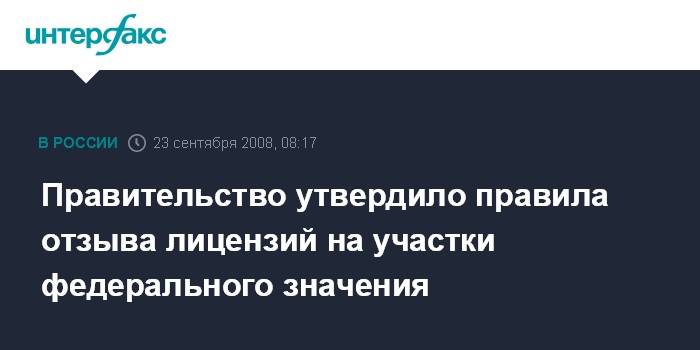 Москва. 23 сентября. INTERFAX.RU - Правительство РФ утвердило положение, опубликованное на сайте кабинета министров, регламентирующее правила отзыва совмещенных лицензий (на геологоразведку и добычу полезных ископаемых) на месторождения федерального значения.
