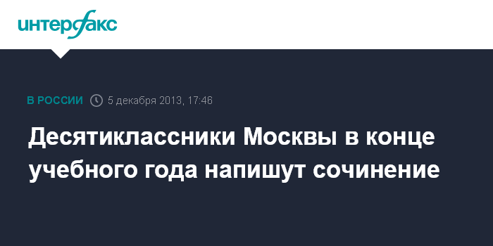 "Десятиклассники завершат учебный год написанием сочинения, которое станет формой промежуточной аттестации. Темы творческих работ станут известны в день написания путем опубликования на официальных сайтах московских школ", - сообщила "Интерфаксу" в четверг пресс-служба департамента образования Москвы.