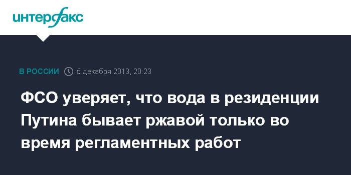 Москва. 5 декабря. INTERFAX.RU - Представитель Федеральной службы охраны объяснил появление ржавой воды из водопроводного крана в одной из резиденций главы государства регламентными работами.