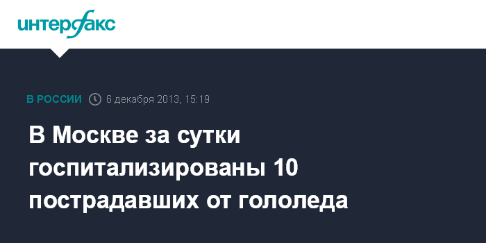 Москва. 6 декабря. INTERFAX.RU - За минувшие сутки 10 человек попали в столичные больницы из-за гололеда, сообщил руководитель департамента здравоохранения Москвы Георгий Голухов.