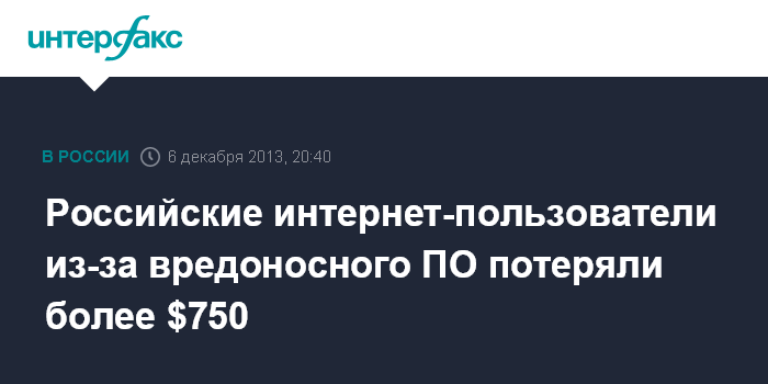 Москва. 6 декабря. INTERFAX.RU - Около 40% российских интернет-пользователей понесли финансовые потери в размере до $750 в результате заражения их персональных компьютеров и гаджетов вредоносным программным обеспечение.