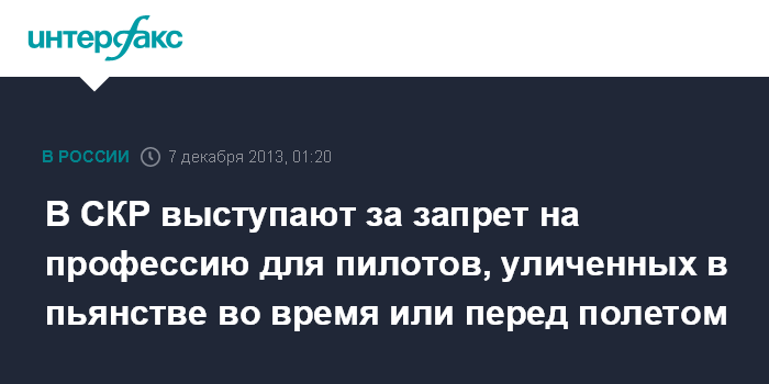 Москва. 7 декабря. ИНТЕРФАКС - В Следственном комитете России (СКР) считают, что для уличенных в употреблении алкоголя пилотов должен действовать запрет на профессию.