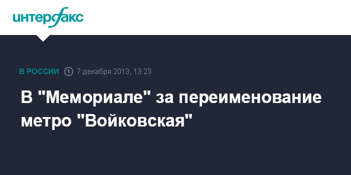 Москва. 7 декабря. INTERFAX.RU - В правозащитном обществе "Мемориал" поддержали идею депутатов из "Справедливой России" переименовать станцию метро "Войковская" и несколько проездов в Москве, которые названы в честь большевика Петра Войкова.