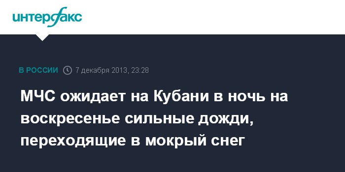 Краснодар. 7 декабря. ИНТЕРФАКС-ЮГ - Сильный дождь, переходящий в мокрый снег, а также сильное налипание мокрого снега ожидаются в Краснодарском крае с ночи на воскресенье, сообщила пресс-служба Главного управления МЧС РФ по краю.