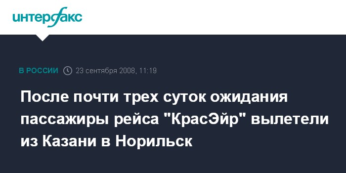 Москва. 23 сентября. INTERFAX.RU - Пассажиры рейса "Краснодар-Норильск" авиакомпании "КрасЭйр" (входит в альянс AirUnion), которые почти трое суток ожидали самолета в международном аэропорту "Казань" (Татарстан), вылетели во вторник утром в Норильск.