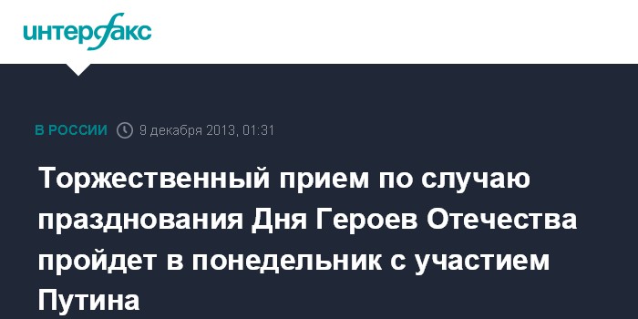 Москва. 9 декабря. ИНТЕРФАКС - Президент России Владимир Путин в понедельник примет участие в торжественном приеме по случаю празднования Дня Героев Отечества, который впервые пройдет в Георгиевском зале Большого Кремлевского дворца.