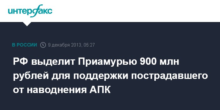 Хабаровск. 9 декабря. ИНТЕРФАКС-ДАЛЬНИЙ ВОСТОК - Амурская область получит из федерального бюджета 900 млн рублей на поддержку производителей сельхозпродукции, пострадавших от наводнения, сообщает в понедельник пресс-служба правительства региона.