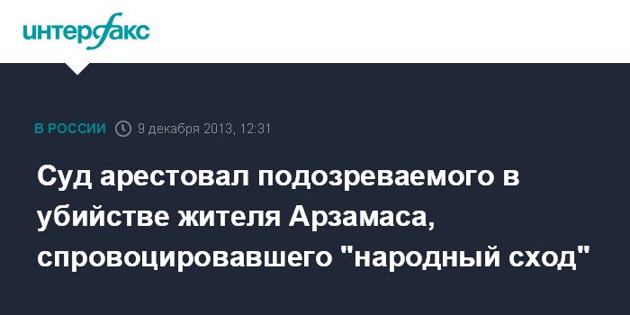 Нижний Новгород. 9 декабря. INTERFAX.RU - Заключен под стражу один из трех подозреваемых в убийстве жителя города Арзамаса Нижегородской области, после которого в выходные на городской Соборной площади состоялся так называемый народный сход.