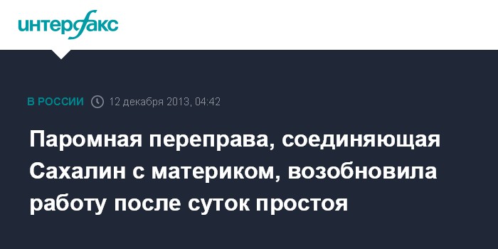 Южно-Сахалинск. 12 декабря. ИНТЕРФАКС - ДАЛЬНИЙ ВОСТОК - Паромная переправа Ванино - Холмск, соединяющая Сахалин с материковой частью РФ, восстановила свою работу после суток простоя из-за циклона, сообщили агентству "Интерфакс - Дальний Восток" в Сахалинском морском пароходстве (СахМП).