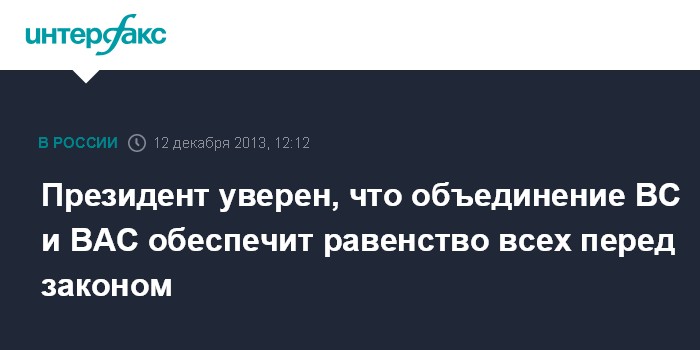 Москва. 12 декабря. INTERFAX.RU - Президент РФ Владимир Путин считает, что объединение Верховного и Высшего арбитражного судов позволит обеспечить выполнение основного конституционного принципа - равенства всех перед законом.