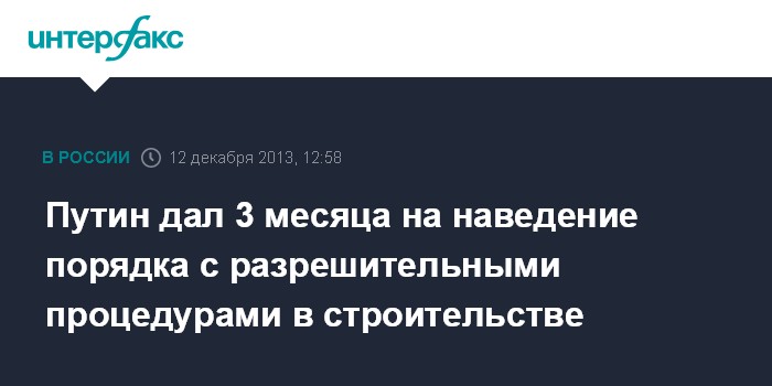 "Прошу установить единый исчерпывающий перечень разрешительных документов на строительство, предельно сократить сроки необходимых процедур и сделать это до конца марта 2014 года", - заявил Путин, обращаясь с посланием Федеральному собранию в Кремле.