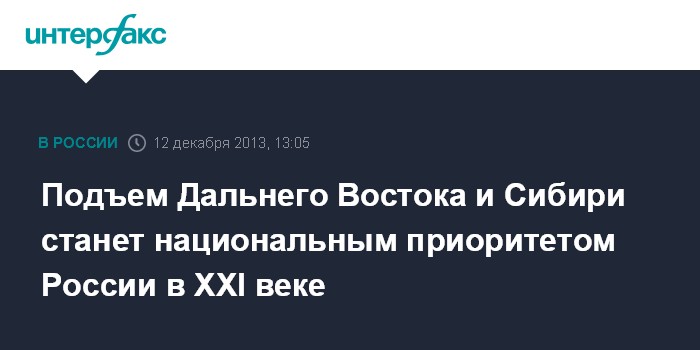 Москва. 12 декабря. INTERFAX.RU - Подъем Сибири и Дальнего Востока - абсолютный приоритет развития России в XXI веке, заявил президент РФ Владимир Путин.