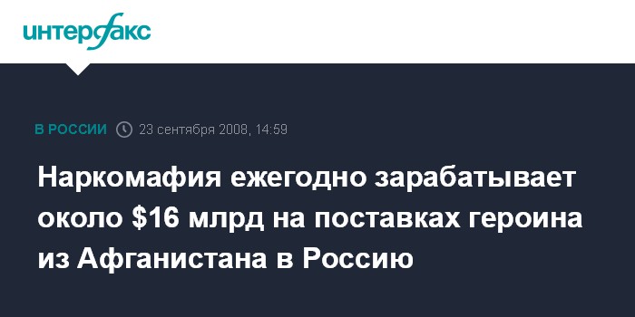 "Наркомафия от реализации этого объема получает порядка $16 миллиардов. Это дестабилизирует и политические системы стран транзита, и служит подпиткой для террористической сети, в том числе на Северном Кавказе", - сказал Иванов на пресс-конференции в центральном офисе "Интерфакса" во вторник.