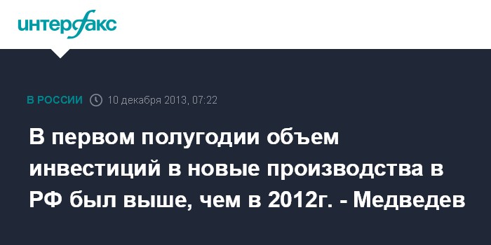 "Кстати, и в первом полугодии объявленный объем инвестиций в новые производства был даже, может быть, чуть выше, чем в 2012 году, несмотря на кризис, который существует в мировой экономике и в мировой финансовой системе", - сказал Д.Медведев.