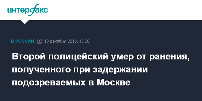 Москва. 13 декабря. INTERFAX.RU - Скончался второй сотрудник полиции, раненный при задержании подозреваемых в вымогательстве на севере Москвы, сообщили "Интерфаксу" в пресс-службе ГУ МВД России по Москве.