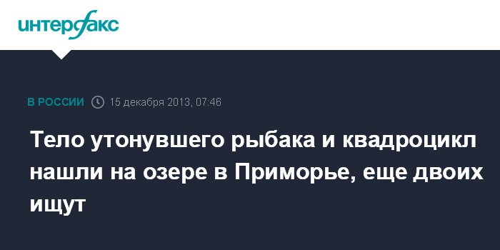 Владивосток. 15 декабря. ИНТЕРФАКС - Спасатели обнаружили тело одного из трех рыбаков, провалившихся на квадроцикле под лед на озере Ханка в Ханкайском районе Приморского края.