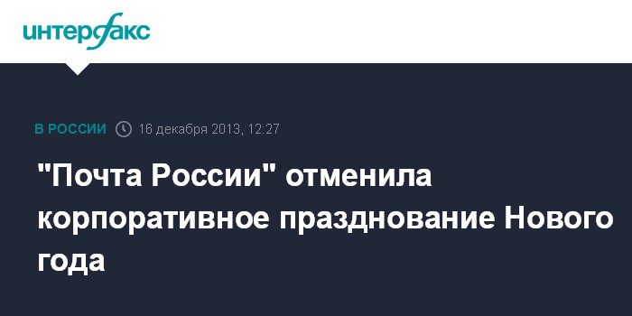 Москва. 16 декабря. INTERFAX.RU - ФГУП "Почта России" по решению руководства отказалось от корпоративного празднования Нового года, говорится в сообщении компании.