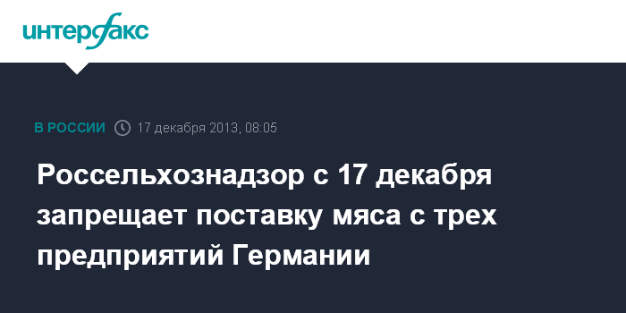 Москва. 17 декабря. INTERFAX.RU - Россельхознадзор с 17 декабря запрещает ввоз мяса и мясной продукции с трех предприятий Германии.
