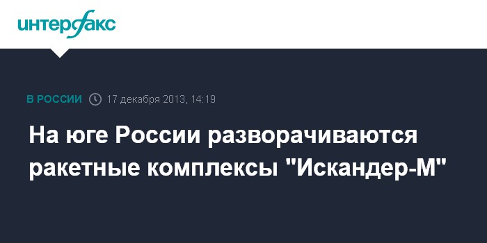 Москва. 17 декабря. INTERFAX.RU - В Южный военный округ во вторник прибыл первый дивизион оперативно-тактических ракетных комплексов (ОТРК) "Искандер-М", передал корреспондент "Интерфакса".