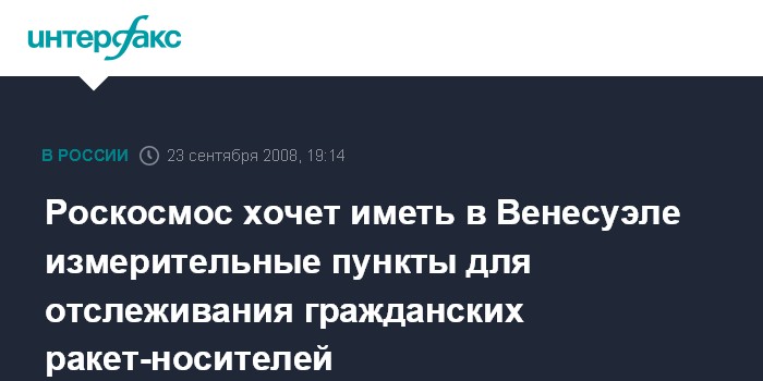 "Нам бы хотелось иметь ряд гражданских измерительных пунктов для отслеживания наших гражданских ракет-носителей", - сказал он. Однако данный вопрос, добавил Перминов, не рассматривался во время визита российской делегации в Венесуэлу. "Мы рассматривали пока только правовые отношения и начали готовить совместный договор об использовании космического пространства в мирных целях", - сказал он.