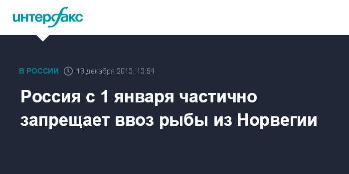 Москва. 18 декабря. INTERFAX.RU - Россия с 1 января запрещает ввоз некоторых видов рыбы и рыбной продукции из Норвегии.