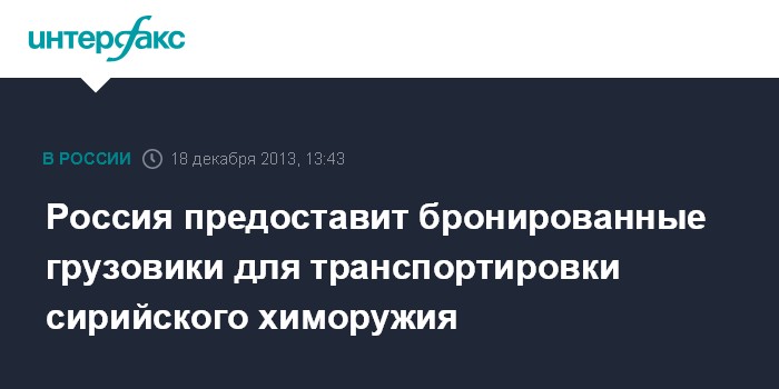 Брюссель. 17 декабря. INTERFAX.RU - Россия предоставит большое количество бронированных грузовиков для участия в операции по вывозу химоружия из Сирии, сообщили в среду в Организации по запрещению химического оружия (ОЗХО).