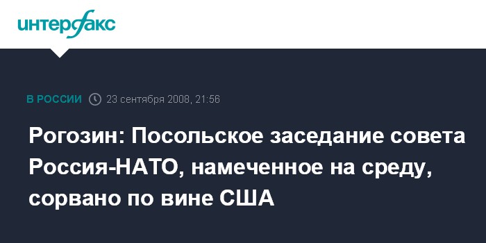 Москва. 23 сентября. INTERFAX.RU - Постпред России при НАТО Дмитрий Рогозин заявил, что по вине делегации США при северо-атлантическом альянсе сорвано намеченное на среду посольское заседание совета Россия-НАТО.