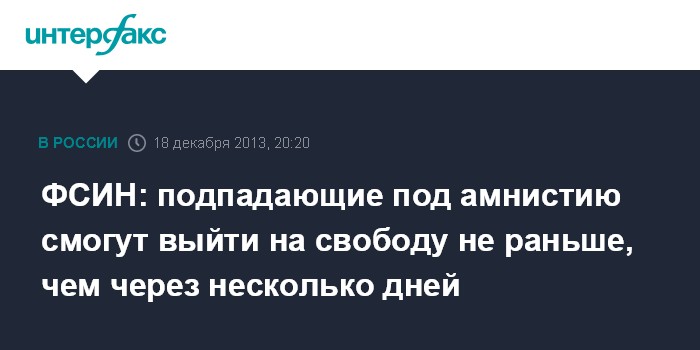 Москва. 18 декабря. INTERFAX.RU - Заключенные, подпадающие под амнистию, приуроченную к 20-летию Конституции России, смогут реально выйти на свободу не раньше, чем через несколько дней, поскольку процедура освобождения в таких случаях проходит в несколько этапов, сообщили в пресс-бюро ФСИН.