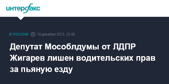 Москва. 18 декабря. INTERFAX.RU - Мировой суд назначил депутату Мособлдумы от ЛДПР Кириллу Жигареву наказание в виде штрафа в 30 тыс. руб. и лишения прав за управление автомобилем без прав в состоянии алкогольного опьянения.
