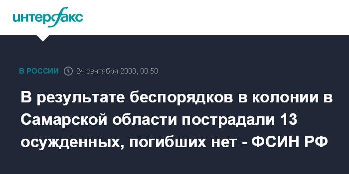 Самара. 23 сентября. ИНТЕРФАКС-ПОВОЛЖЬЕ - Тринадцать заключенных пострадали в ходе инцидента в одной из колоний в Самарской области, погибших нет, сообщили агентству "Интерфакс-Поволжье" в пресс-службе ГУ ФСИН по Самарской области.