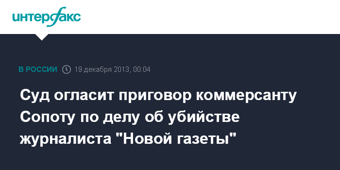 Москва. 19 декабря. INTERFAX.RU - Люблинский суд столицы в четверг огласит приговор бизнесмену Павлу Сопоту по делу об убийстве журналиста "Новой газеты" Игоря Домникова в 2000 году.