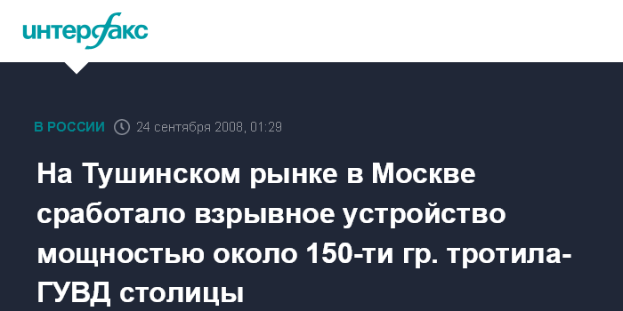 Москва. 24 сентября. ИНТЕРФАКС-МОСКВА - Срабатывание самодельного взрывного устройства мощностью около 150-ти граммов в тротиловом эквиваленте стало причиной взрыва на Тушинском рынке в Москве, сообщил "Интерфаксу" официальный представитель управления информации и общественных связей ГУВД столицы.
