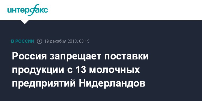 Москва. 19 декабря. INTERFAX.RU - Россельхознадзор с 19 декабря запрещает поставки продукции с 13 молочных предприятий Нидерландов.