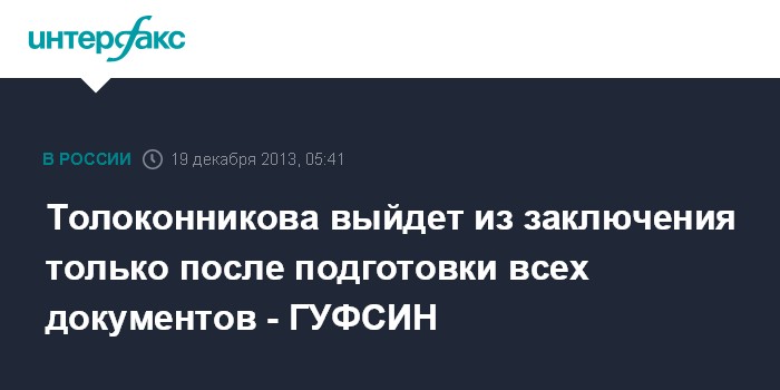 Красноярск. 19 декабря. INTERFAX.RU - Сроки освобождения из заключения участницы панк-группы "Pussy Riot" Надежды Толоконниковой зависят от наличия всех необходимых документов, сообщила в четверг агентству "Интерфакс-Сибирь" руководитель пресс-службы ГУФСИН России по Красноярскому краю Екатерина Броцман.
