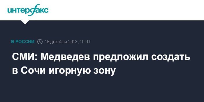 Москва. 19 декабря. INTERFAX.RU - Премьер-министр РФ Дмитрий Медведев дал поручение рассмотреть идею создания на территории Сочи, где построены олимпийские объекты, туристско-рекреационной особой экономической зоны (ОЭЗ) и игорной зоны в Красной Поляне, сообщает газета "Коммерсантъ".