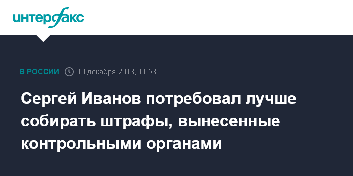 "Еще одна проблема - реализация вынесенных решений. Напомню, что в 2012 г. контрольно-надзорными органами федерального уровня было наложено порядка 1 млн 200 тысяч административных штрафов, их общая сумма составила 19 млрд рублей. Взыскано, к сожалению, только две трети, 12,5 млрд. То есть, 7 млрд, извините, растворились. Где деньги?" - сказал Иванов на совещании контрольных органов.