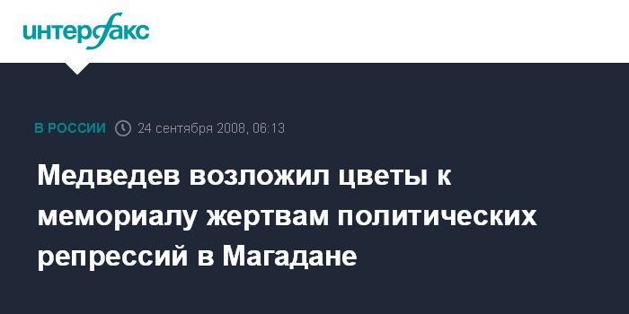 Магадан. 24 сентября. ИНТЕРФАКС - Президент России Дмитрий Медведев возложил цветы к мемориалу "Маска скорби", который сооружен в память о жертвах политических репрессий.