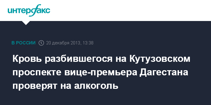 Москва. 20 декабря. INTERFAX.RU - Кровь вице-премьера Дагестана Гаджи Махачева, являющегося предполагаемым виновником ДТП на Кутузовском проспекте, в котором погибли три человека, будет проверена на содержание алкоголя, сообщили "Интерфаксу" в пресс-службе московской полиции.