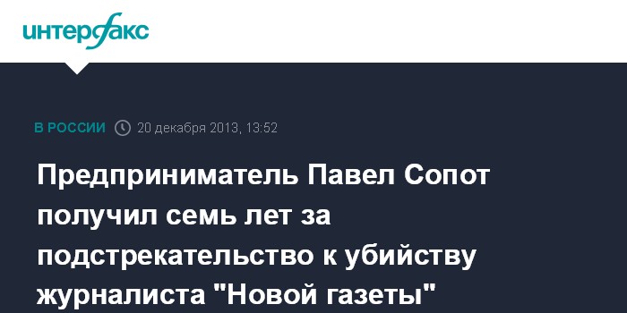 Москва. 20 декабря. INTERFAX.RU - Люблинский суд Москвы в пятницу приговорил бизнесмена Павла Сопота к 7 годам колонии строгого режима по делу об убийстве журналиста "Новой газеты" Игоря Домникова в 2000 году.