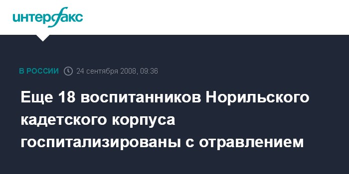 Москва. 24 сентября. INTERFAX.RU - По данным на среду, в инфекционных отделения больниц Красноярского края находятся 47 воспитанников школы-интерната "Норильский кадетский корпус", госпитализированных с симптомами отравления.