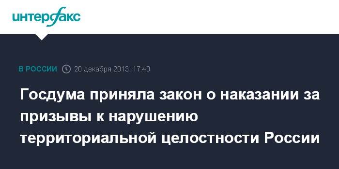 Москва. 20 декабря. INTERFAX.RU - Госдума в пятницу приняла сразу во втором и третьем чтениях закон, предусматривающий штраф до 300 тыс. рублей или лишение свободы до пяти лет за призывы к нарушению территориальной целостности России.