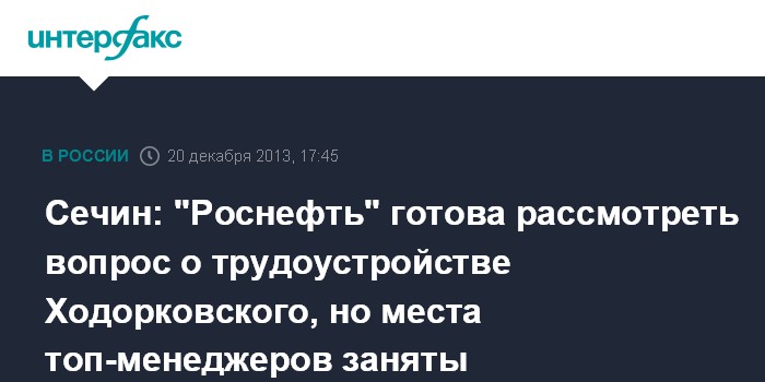 Москва. 20 декабря. INTERFAX.RU - Компания "Роснефть" готова рассмотреть вопрос о трудоустройства экс-главы ЮКОСа Михаила Ходорковского, но места топ-менеджеров в настоящее время заняты, заявил глава компании Игорь Сечин.