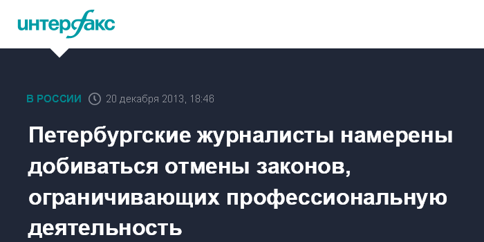 Санкт-Петербург. 20 декабря. INTERFAX.RU - Союз журналистов Санкт-Петербурга и Ленинградской области заявляет о намерении добиваться, в том числе в судебном порядке, отмены законов, ограничивающих профессиональную деятельность журналистов.