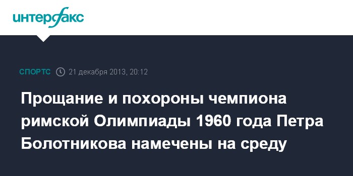 Москва. 21 декабря. INTERFAX.RU - Церемония прощания и похороны победителя Олимпиады-1960 в Риме в беге на 10000 м Петра Болотникова намечены на 25 декабря, сообщили "Интерфаксу" в субботу в семье спортсмена.